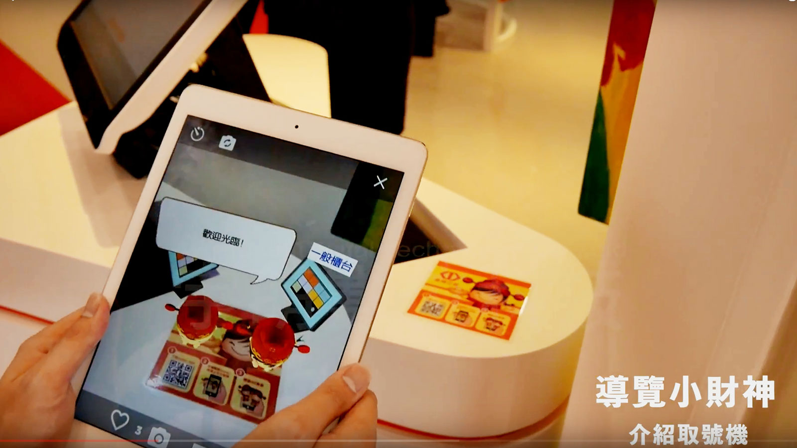 台灣企銀開創全台首例,結合擴增實境應用,請出銀行吉祥物「財神寶寶」作為數位分行的導覽人員。